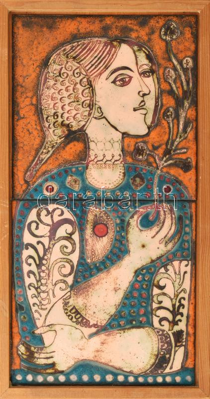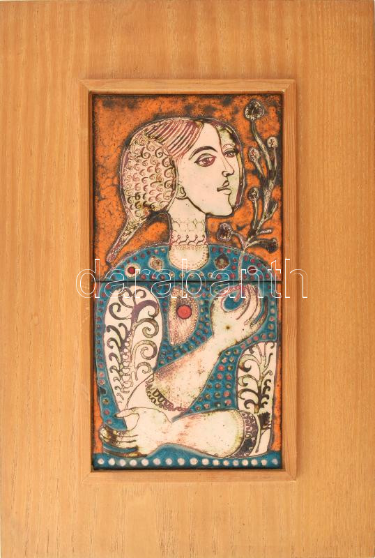 Beschreibung: Stefániay Edit (1936 - ) Nő virággal. Tűzzománc, 20x10 cm, kerettel 30x20 cm