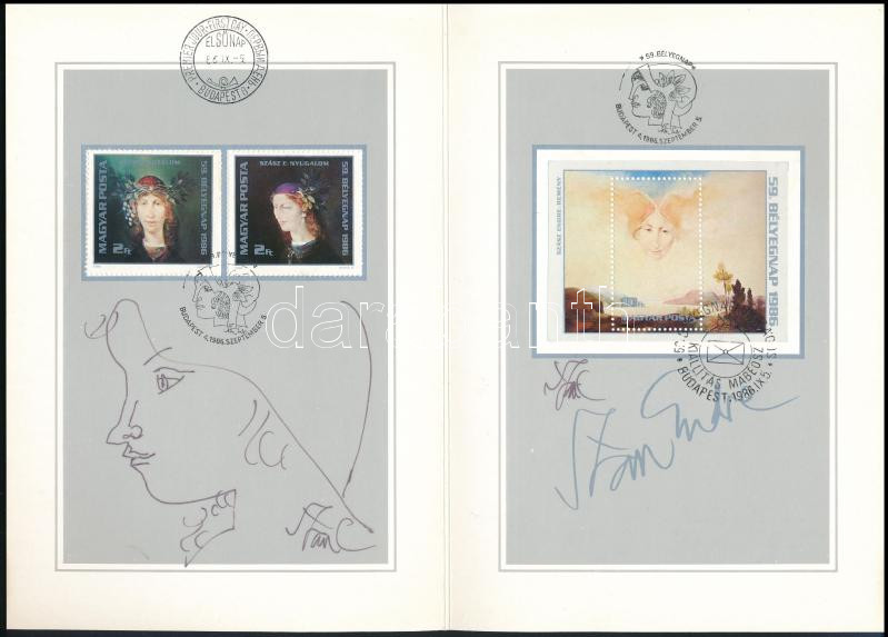 Beschreibung: Szász Endre (1926-2003): Női arc. Filc, papír, az 59. bélyegnapi emléklapon, általa tervezett bélyegekkel
