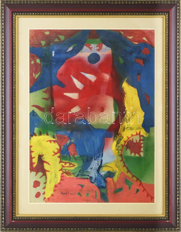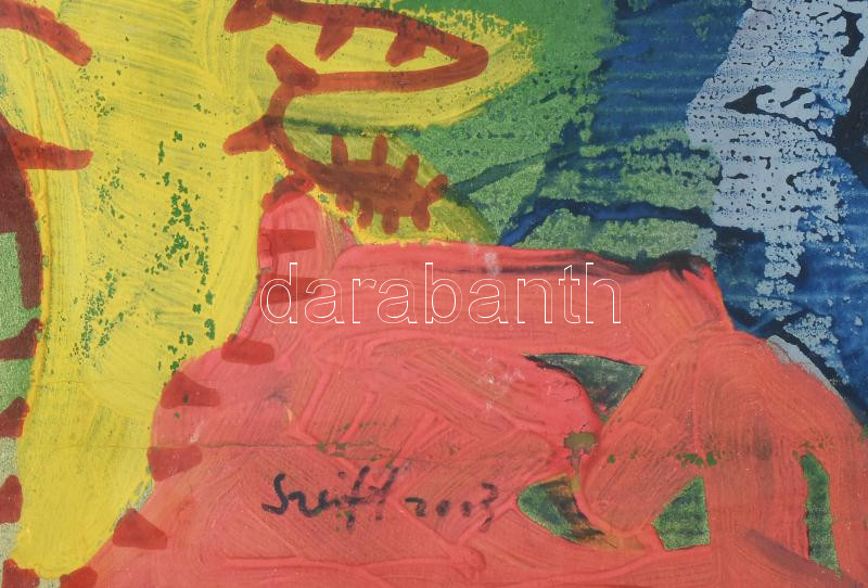 Szeift Béla (1944-2012): Szürrealista kompozíció, 2003. Vegyes technika, karton. Jelzett. Üvegezett, dekoratív fakeretben. 56x40 cm / mixed technique on board