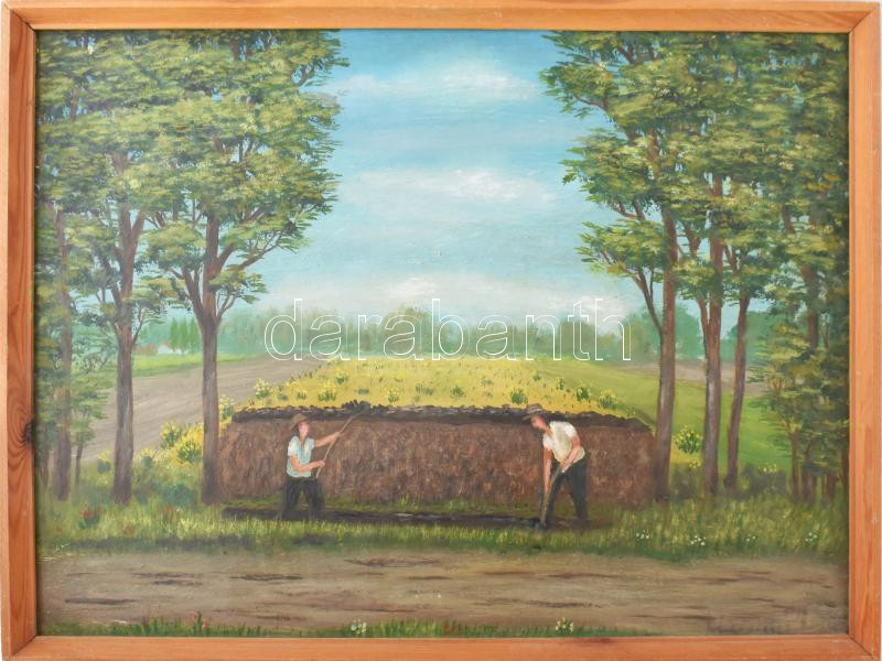 Beschreibung: Uzonyi Imre (1941-1990): Trágyaföldelés. Olaj, farost. Jelezve jobbra lent. Fakeretben. 42x56 cm