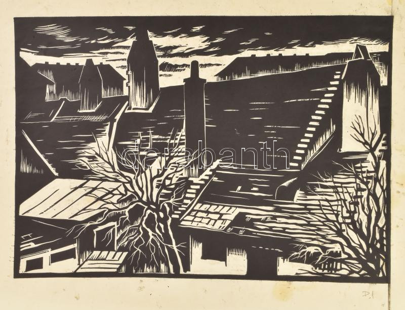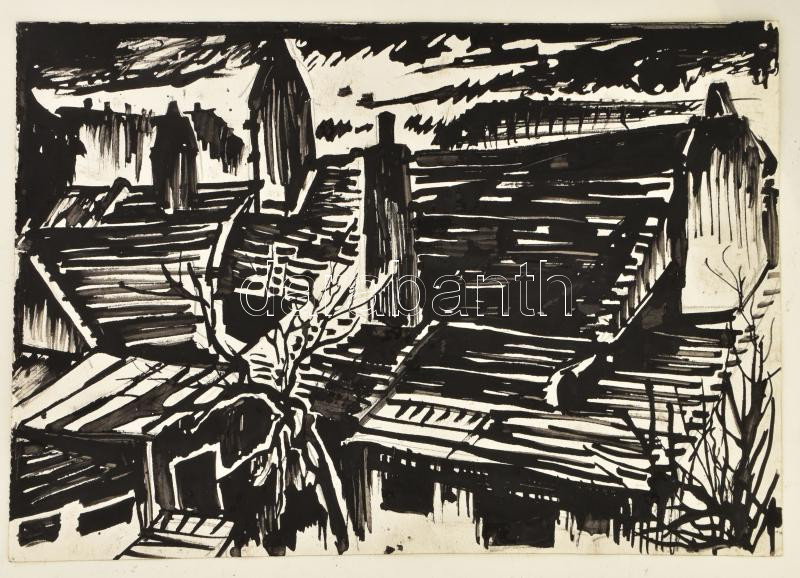 Varga Mátyás (1910-2002), 2 db mű: Soproni udvar, 1934. Tus, papír és fametszet, papír, mindkettő jelzés nélkül, Varga Mátyás által feliratozott papírban. Fametszet P. 1. felirattal (feltehetően próbanyomat). A tusrajz alapján készült a fametszet! 25×30 cm