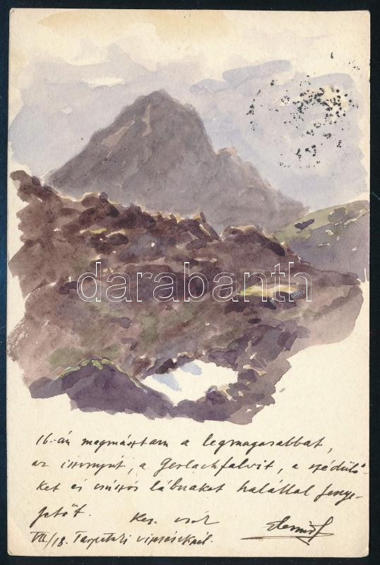 Beschreibung: Veress Zoltán (1868-1935): Gerlachfalvi-csúcs, Tátra. Akvarell, papír, jelzett. 14x9,5 cm. Levelezőlapon, postázva, Veress Zoltán autográf soraival.