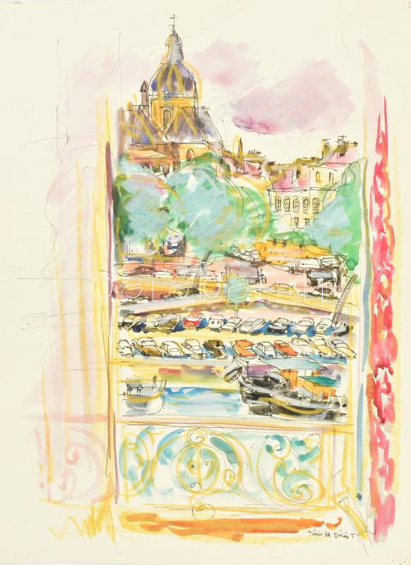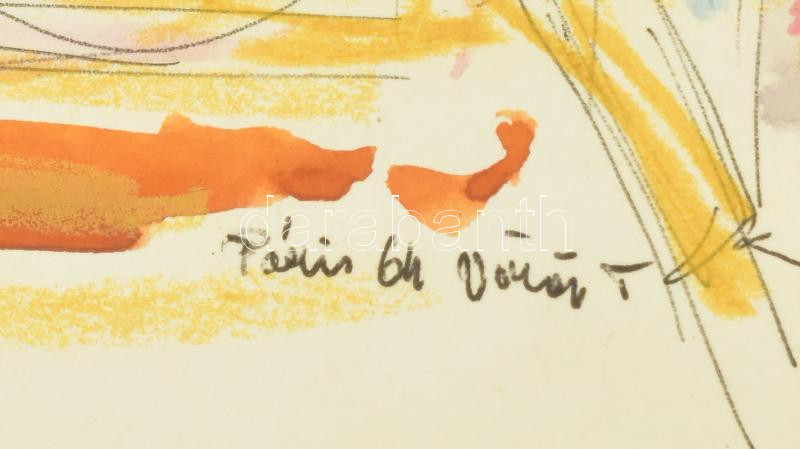 Beschreibung: Vöröss Tibor (1911-1999): Párizsi részlet, 1964. Kréta, akvarell, tus, papír, jelzett. 38×30 cm