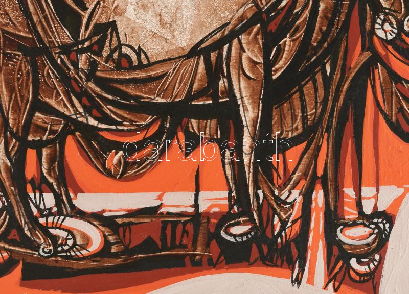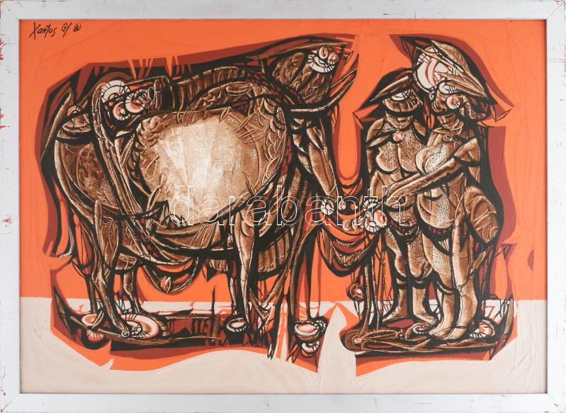 Xantus Gyula (1919-1993): Őskor, 1980. Akril, farost. Jelezve balra fent, hátoldalán autográf felirattal. Dekoratív fakeretben. 50x70 cm / oil on fibre board, signed upper left, with autograph description on the reverse, framed