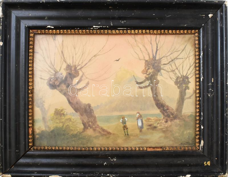 Beschreibung: báró Szveteney György (1871-1952): Vízparti találkozás. Akvarell, papír. Jelzett. Dekoratív, üvegezett, sérült fakeretben. 28x40 cm