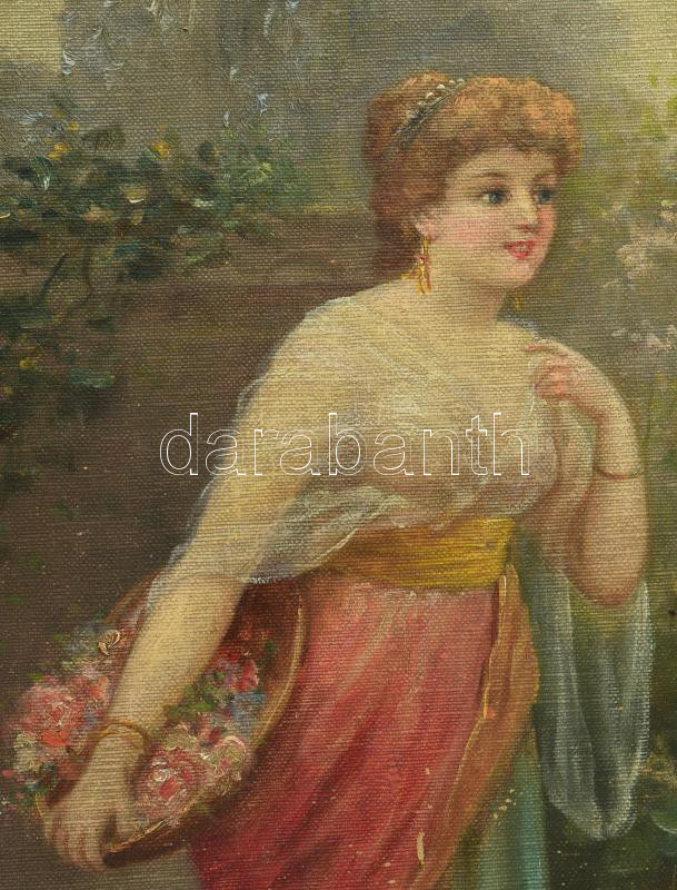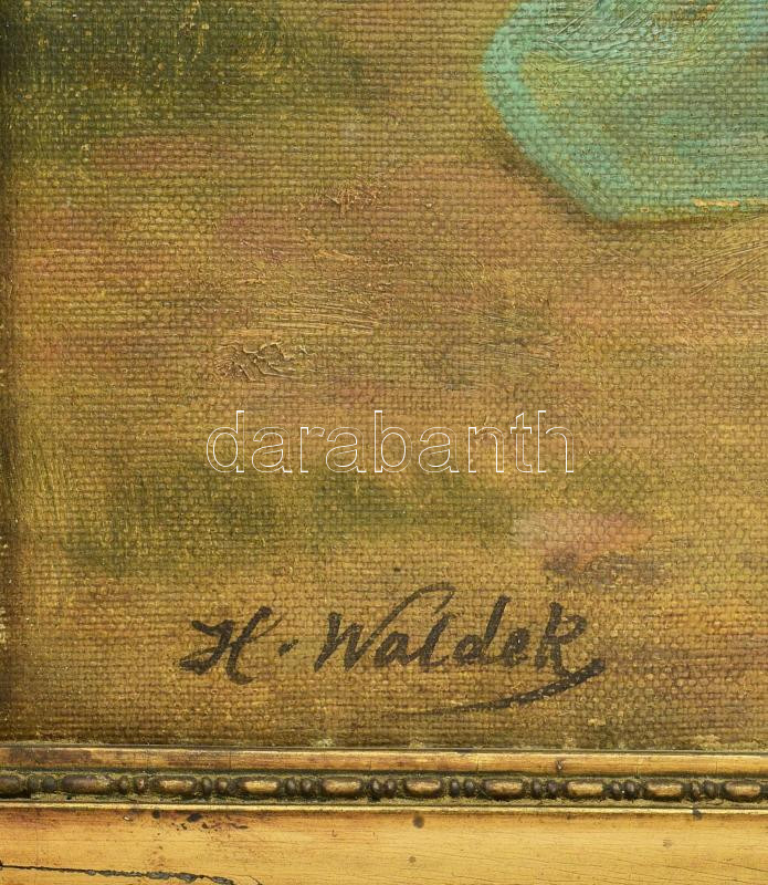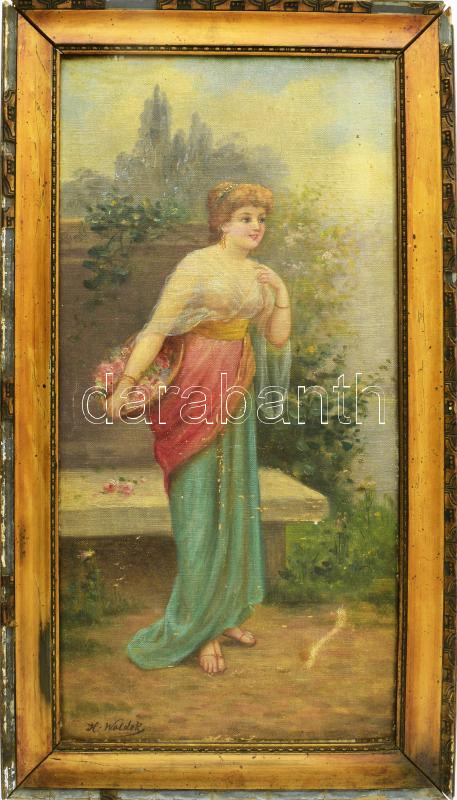 H. Waldek jelzéssel, XIX. sz. vége/XX. sz. eleje: Virágárus lány. Olaj, vászon. Kissé sérült. 53x26 cm. Szecessziós, korabeli, sérült fakeretben.