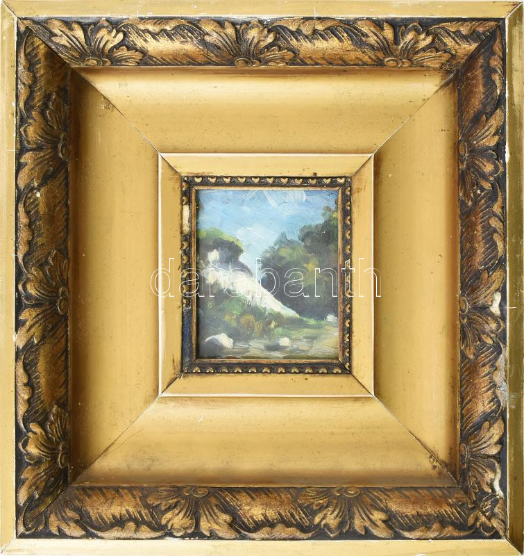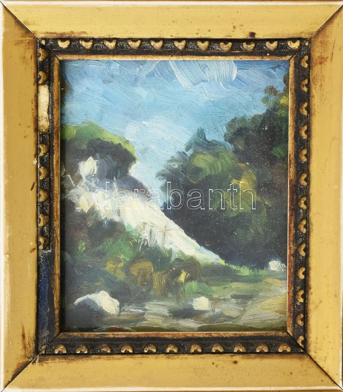 Jelzés nélkül: Napfényes táj. Olaj, karton. Üvegezett, dekoratív, kissé sérült fakeretben. 11x10 cm