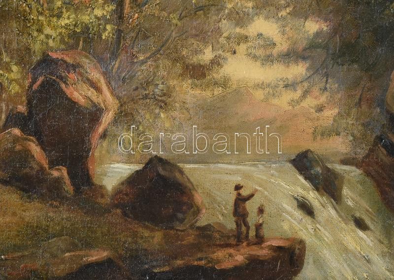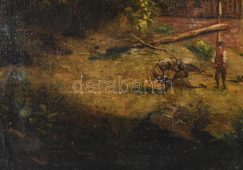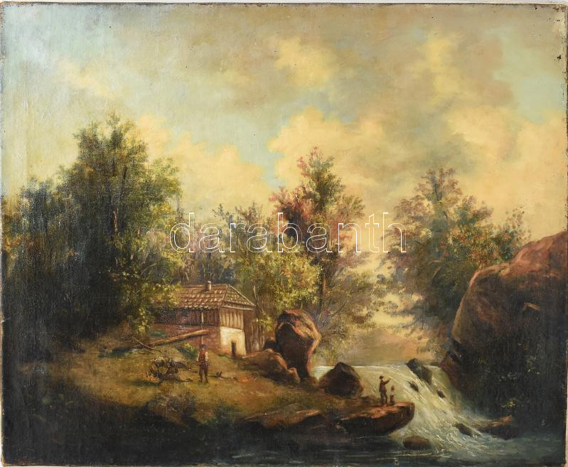 Jelzés nélkül, XIX. sz. osztrák v. német festő: Vízparti jelenet. Olaj, vászon, restaurált, sérült. 55x69 cm