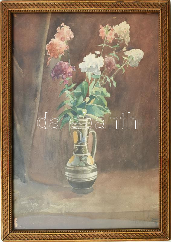 Beschreibung: Olvashatatlan (Balás?) jelzéssel: Csendélet. Akvarell, papír, üvegezett fakeretben. 43x30 cm