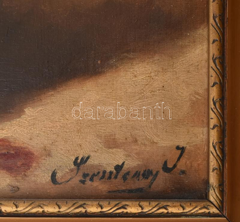 Beschreibung: Olvashatatlan (Szentessy?) jelzéssel: Csendélet. Olaj, falemez. Dekoratív fakeretben, 50×35 cm /