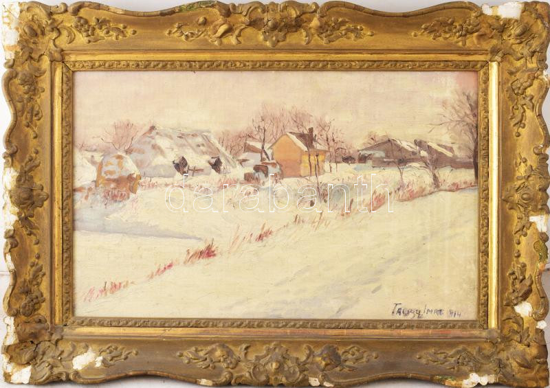 Beschreibung: Olvashatatlan jelzéssel, magyar festő, XX. sz. eleje: Havas táj. Olaj, karton. Dekoratív, sérült fakeretben. 30×47 cm
