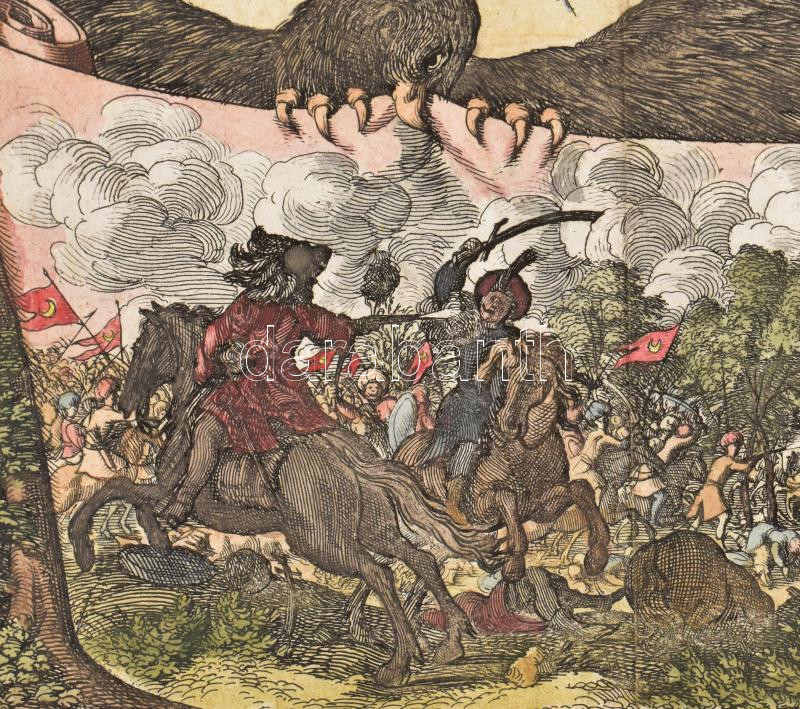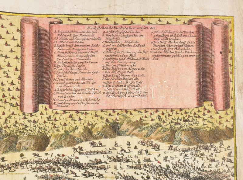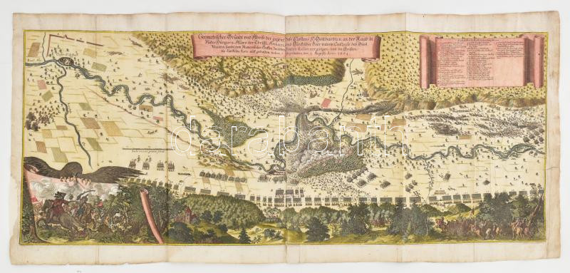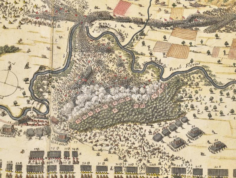 1664 Szentgotthárdi csata színezett rézmetszet. Címe középen szószalagon : Geometrischer Grundt und Abriss der gegent dess Klosters St. Gotthardten an der Raab in Nider Hungarn. Allwo der Christl: Armeen und Türckisches Heer unterm Comando dess Gross Veziers, sambt dem Memorabilen Treffen zwischen beiden theilen von gangen, und die Christen die Türckische Furie auff gehalten haben so geschehen den 1. Augusti. Anno. 1664 Megjelent : Matthäus Merian Theatrum Europeum című művében 1672-ben Frankfurt-ban. A két nézetű metszeten a Rába folyó és környékének madártávlati képen a seregek hadrendje látható, előterében ? a kor metszeteihez hasonlóan ? csatázó seregek. A szentgotthárdi csata 1664. augusztus 1-jén zajlott, amikor a Raimondo Montecuccoli vezette keresztény csapatok összecsaptak az Oszmán Birodalom Köprülü Ahmed vezette hadseregével Szentgotthárd vidékén. Az európai hadak váratlanul elsöprő győzelmet arattak. Magyarországon a török elleni háborúk során ennek óriási jelentősége volt, hisz Mohács (1526) és Mezőkeresztes (1596) után ez volt az első nagy, nyílt ütközet, amely ráadásul nem a török győzelmével végződött.