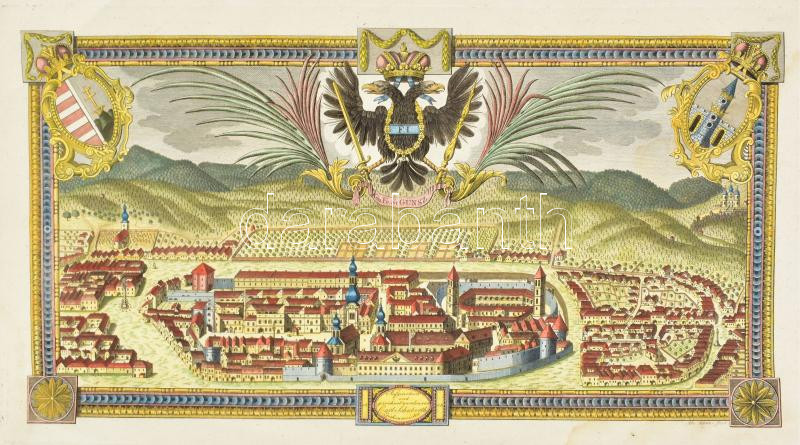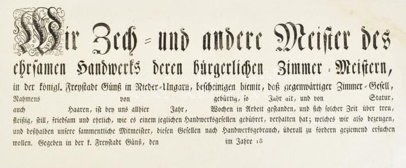 Kőszeg város színezett látképe asztalos mesterlevélen. A nagyon kevés korai Kőszeg ábrázolás talán legszebb darabja. Wien 1808, Carl Schubert. Rézkarc?rézmetszet. A látkép címe felül, az osztrák címer alatt: Kön. Fr. St. Günsz. Alul középen: Aufgenommen und gezeichnetworden von Carl Schuberth Zeichenmeister 1808. Balra fent a koronás magyar címer, jobbra a város címere látható, a város képe mögött szőlőhegyek. A kép alatt jobbra ?Alo Adams? fecit? jelzet. A kép alatt ?Wir Zech- und andere Meister des ehrsamen handwers deren bürgelichen Zimmer-Meister?? kezdetű kitöltetlen céhlevél a megfelelő részeken az adatok beírására kihagyott felülettel. A nyomólemez mérete: 23,7×44 cm. Lapméret: 48×64 cm. Képmezőn kívül folttal, nagyon szép állapotban. Folttal