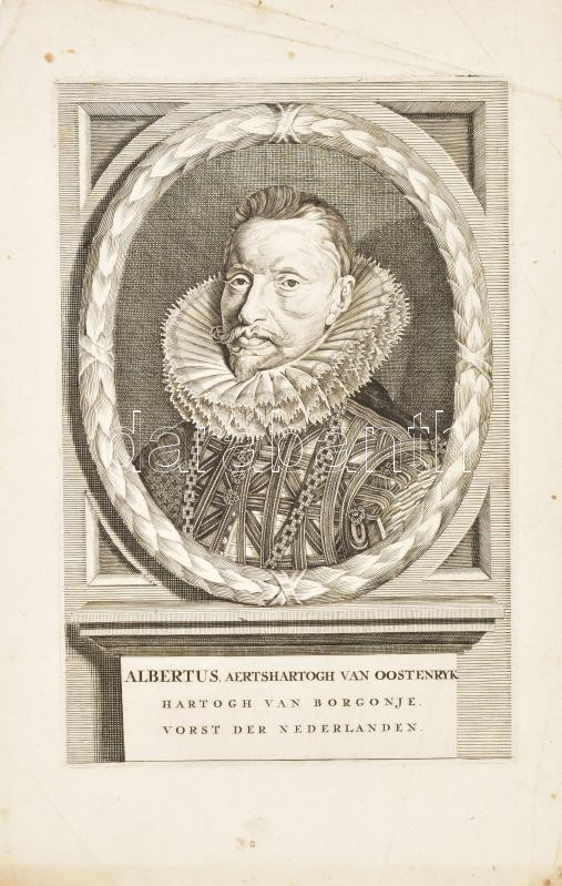 VII. Albert (1559-1621) Habsburg-házi osztrák főherceg portréja, rézmetszet, papír, jelzés nélkül, hsjtásnyomokkal, lapszéli foltokkal és apró sérülésekkel, 26x18 cm