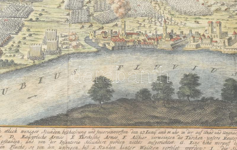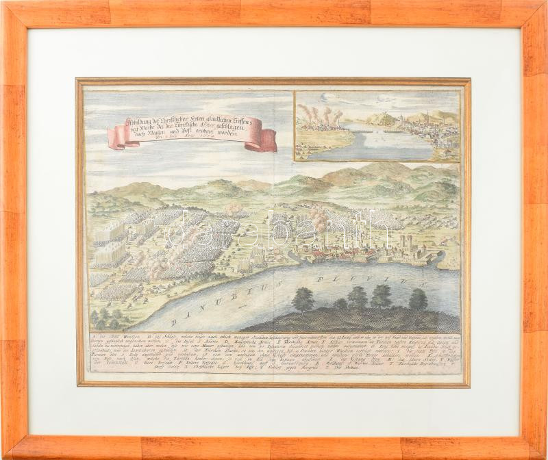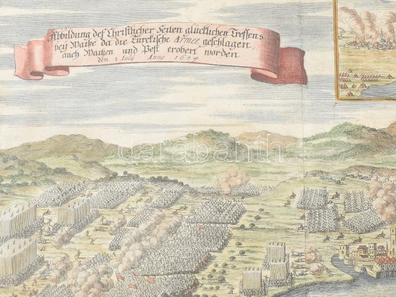 Vác látképe a váci csatával, a metszet felső sarkában Pest és Buda látképével, az 1684. évi ostromlátképpel. A képmezőn bal oldalon szószalagon: Abbildung der Christlicher Reiten glückliches Treffens bey Waitze Megjelent : Matthäus Merian : Theatrum Eurpoaeum című művében1691-ben Frankfurt-ban A metszeten a korában jelentős erődítésnek számító Vác városa. Az erődített váron, a minareten kívül jól kivehető a Vácot övező Börzsöny, továbbá a mezőn lovasok, muskétás és szálfegyveres gyalogosok. Mellettük tüzérségi egységek. Ajobb sarokban lévő részleten Pest és Buda sikertelen ostromának képe. A déli tájolású Pest?Buda-metszeten a Gellérthegy, a török fürdők, a minaretek, a mecsetté alakított Mátyás-templom képe. Szalai I. Vác 1691/1. Rózsa. (Budapest régi) 46/a.