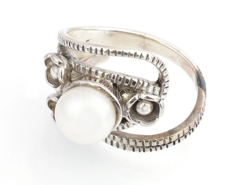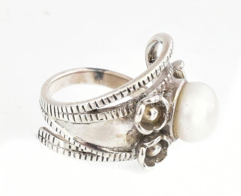 Beschreibung: Ezüst(Ag) gyűrű nagy méretű tenyésztett gyönggyel, jelzett, méret: 55, bruttó: 11,1 g