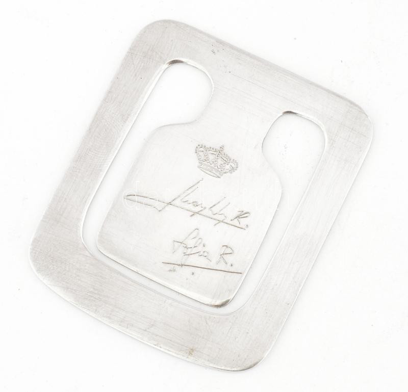 Ezüst(Ag) könyvjelző, jelzett, 5,5×4,5 cm, nettó: 20g https://www.darabanth.com/de/457-Fernauktion/457.0/Juwellen-und-Kunstobjekte-aus-Edelmetall/Juwellen-und-Kunstobjekte-aus-Edelmetall~2000365/EzustAg-konyvjelzo-jelzett-5-5C3974-5-cm-netto-20g~II3061121