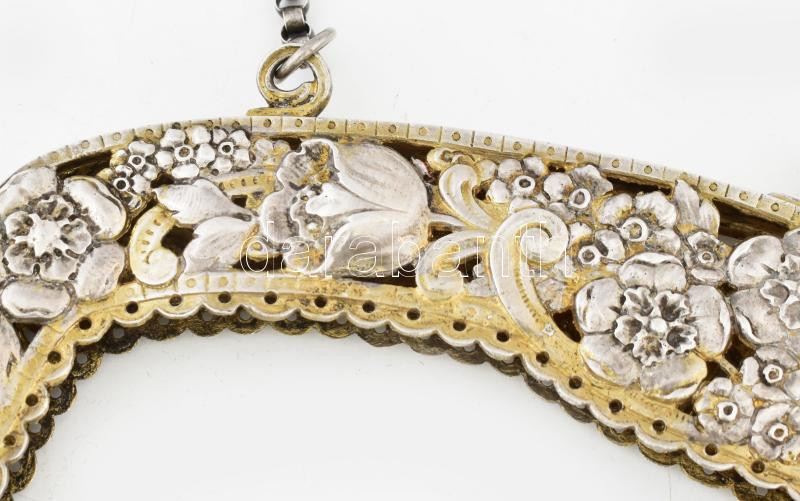 Beschreibung: Szecessziós aranyozott ezüst (Ag) táska keret. Áttört, virág mintás, lánccal, Jelzett 20 cm, 160 g