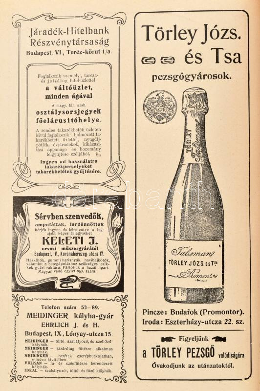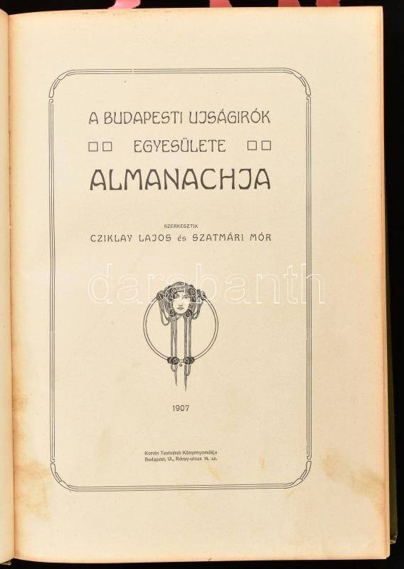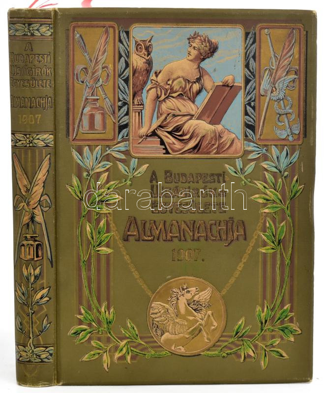 A Budapesti Ujságírók Egyesülete almanachja 1907. Szerk. Cziklay Lajos és Szatmári Mór. Bp., 1907, Korvin Testvérek-ny., 8+304+10 (hirdetések) p. + 12 t. A hirdetések között egész oldalas Kugler Henrik - Gerbaud reklámmal, a szecessziós díszítésű hirdetésben a céghez kötődő budapesti épületek rajzával. Kiadói szecessziós aranyozott, festett egészvászon-kötés, Dörner és Heimberg-kötés, kissé kopott borítóval, de egyébként jó állapotban.