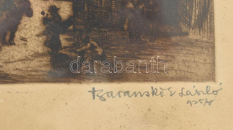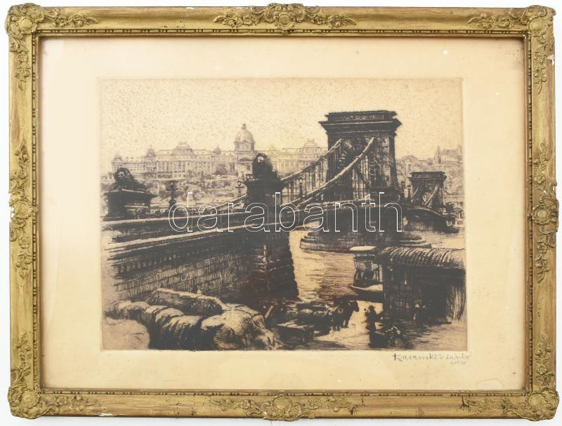 Baranski Emil László (1877-1941): Lánchíd, Budapest. Rézkarc, papír, jelzett. Hátoldalán Árverési Csarnok raglappal 1933-ból. Üvegezett, kissé sérült fakeretben. Lap széle kissé foltos. 22x29,5 cm