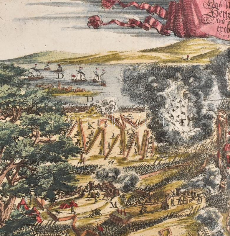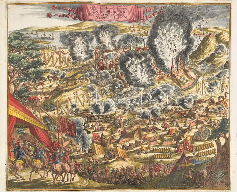 Buda és Pest látképe, Buda 1686-os dekoratív nagyméretű ostromképén. Gyönyörűen színezett rézmetszet. Megjelent: Eberhard Werner Happel : Thesaurus Exoticorum Oder eine mit Ausländischer Raritäten und Geschichten Schatz-kammer Fürstellend Die Asiatische, Afrikanische und Amerikanische Nationes? című művében Hamburgban 1688-ban. Lapméret: 35,5×42,8 cm. A rendkívűl látványos és mozgalmas metszeten a vár ostroma látható, körülötte az ostromló császári sereg katonái és a török védművei. Eberhard Werner Happel (1647-1690) német író ebben a művében az európai és Európán kívüli eseményeket követi nyomon, külön kitér Magyarország történetére és leírására, valamint a török elleni háborúkra. Külön részben írja le a világ különféle egzotikus népeit, amit gazdag illusztrációs anyaggal gazdagít. A kötetek végén a Korán német nyelvű szövegét közli. mérete: 410x310 mm,