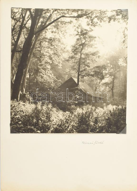 cca 1940 Budapest, a Rómaifürdő vadregényes része, Reich Péter Cornel feliratozott és pecséttel jelzett fotója, fotósarkokkal kartonra rögzítve, szép állapotban, 15×15 cm