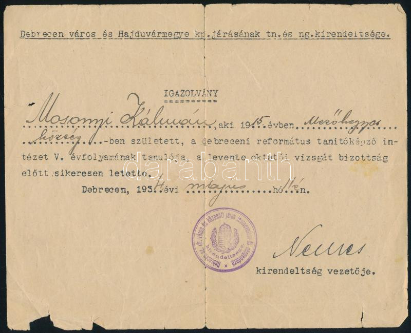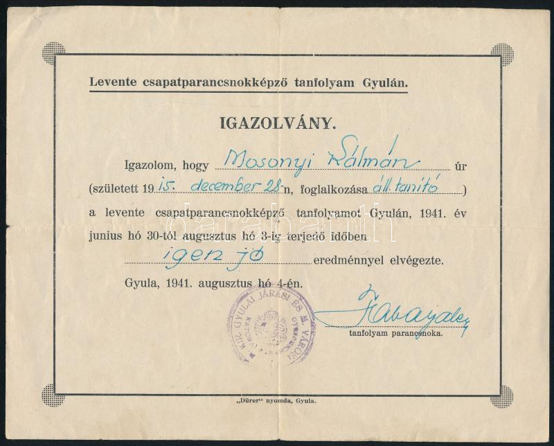 1934-1941 Mosonyi Kálmán részére kiállított igazolványok (2 db), levente oktatói vizsga letételéről, ill. levente csapatparancsnokképző tanfolyam elvégzéséről, az egyik sérült