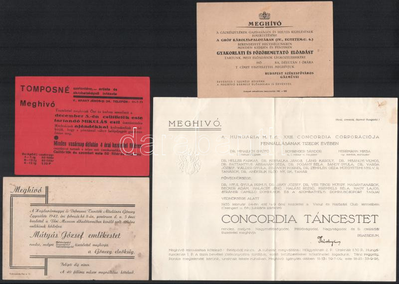 Beschreibung: cca 1930 4 db meghívó Gázművek, szalontánc, Mátyás József emlékest, Concordia táncest, stb