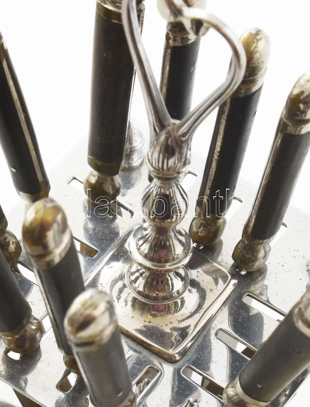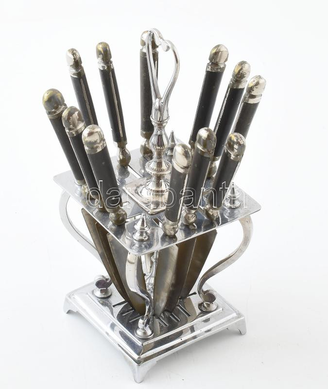 Beschreibung: Art deco stílusú késtartó, benne 12 db késsel, kopással, m: 19,5 cm