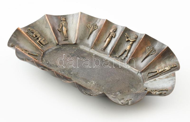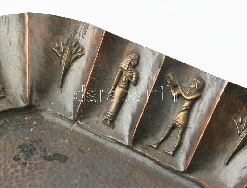 Beschreibung: Egyiptomi alakokkal díszített iparművész kínáló, réz, kopással, 38x23 cm