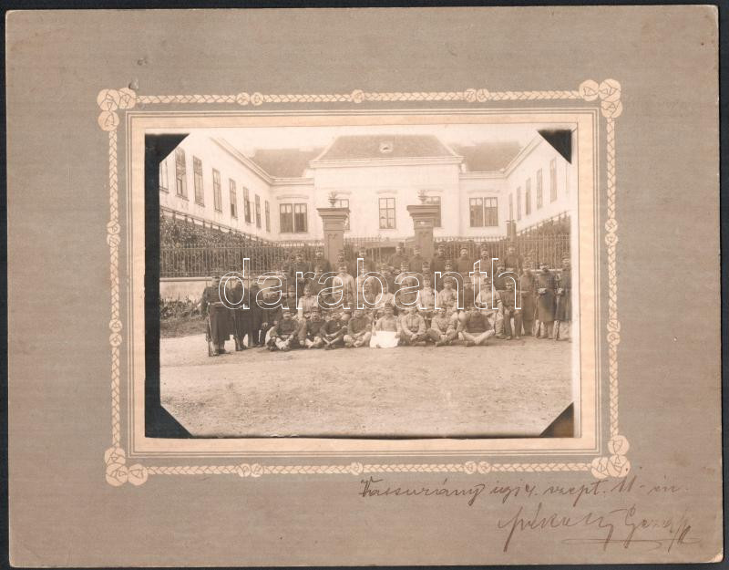 Beschreibung: 1914 Rothermann-Patzenhofer-Schilson-kastély előtt katonák csoportja, feliratozott, kartonra kasírozott fotó, 12,5×16,5 cm