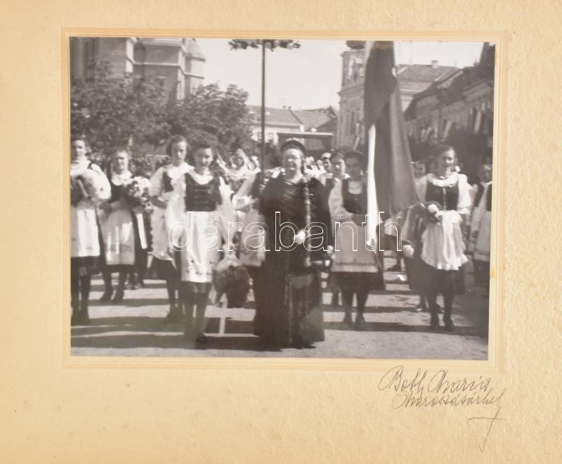 1940 Marosvásárhely, Erdély, diáklányok felvonulása magyar ruhában és zászlóval a bevonulási ünnepségek keretében, Roth Mária kartonra ragasztott fotója, jó állapotban, 17,5×23 cm
