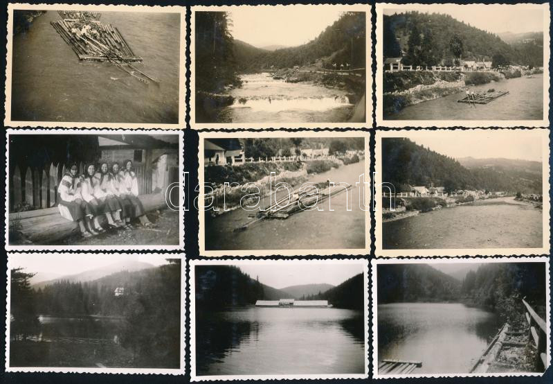 Beschreibung: cca 1940 Kárpátalja, tutajosok, népviselet, Tisza-forrás, stb., 16 db fotó, egyik fotó sarokhiánnyal, 6×8 cm