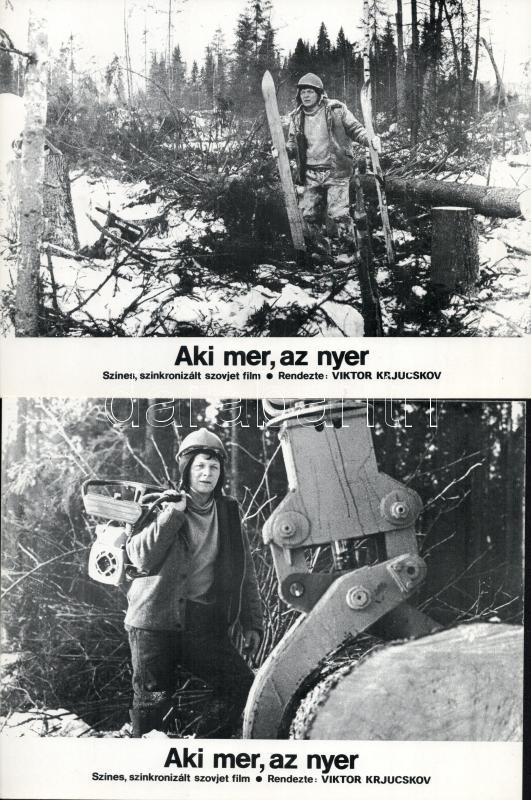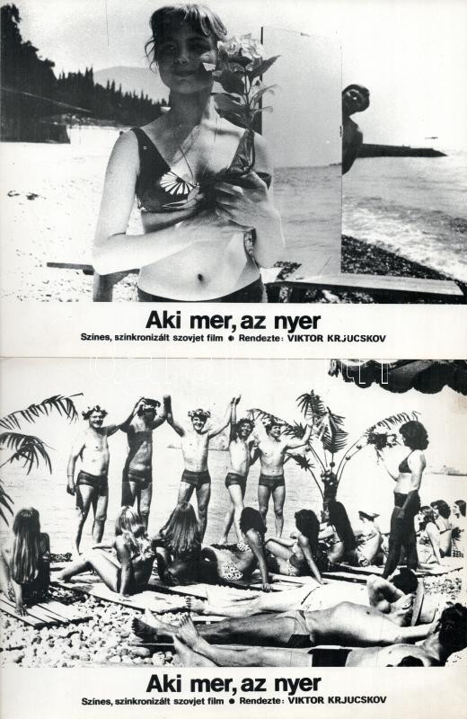 cca 1978 ,,Aki mer, az nyer" című szovjet film jelenetei és szereplői, 4 db produkciós filmfotó (vitrinfotó, lobbyfotó) nyomdatechnikával sokszorosítva kartonpapírra, egyoldalas nyomással, a használatból eredő (esetleges) kisebb hibákkal, 18x24 cm