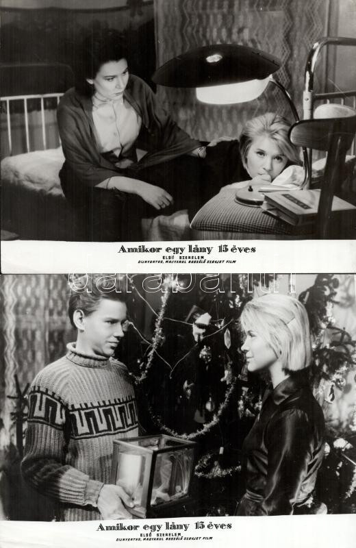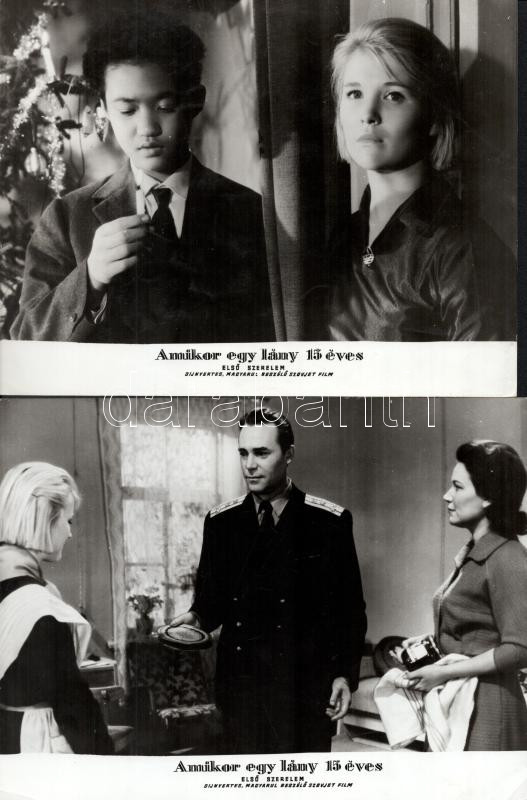 cca 1978 ,,Amikor egy lány 15 éves" című szovjet film jelenetei és szereplői, 4 db vintage produkciós filmfotó (vitrinfotó, lobbyfotó) ezüst zselatinos fotópapíron, a használatból eredő (esetleges) kisebb hibákkal, 18x24 cm