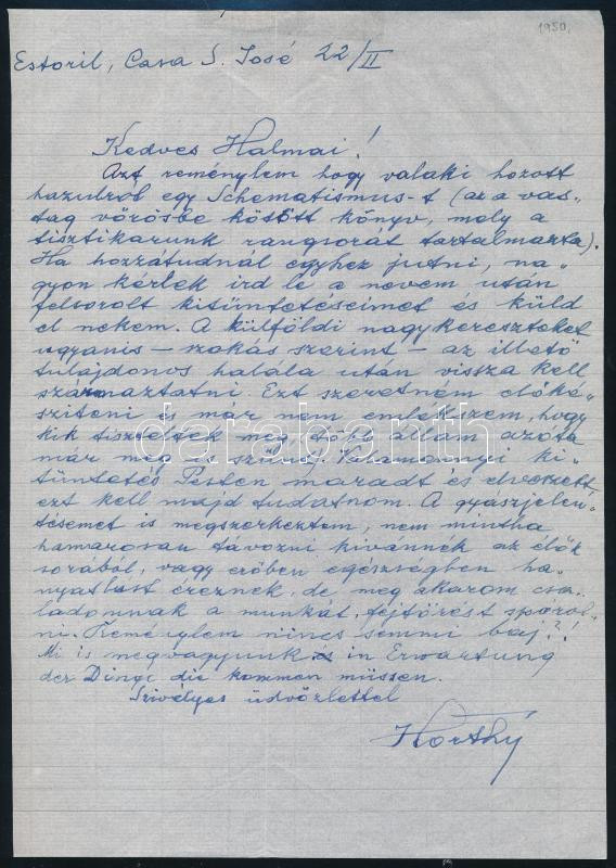1950 Estoril, Casa S. José, Horthy Miklós (1868-1957) politikus, volt kormányzó, tengerésztiszt saját kézzel írt levele Halmai Jenőnek, hogy küldjön schematizmust, amely felsorolja a kitüntetéseit, mert halála után a külföldi nagykereszteket vissza kell adni. "Valamennyi kitüntetés Pesten maradt és elveszett ezt kell majd tudatnom. A gyászjelentésemet is megszerkesztem, nem mintha hamarosan távozni kívánnék az élők sorából, vagy erőben hanyatlást éreznek, de meg akarom családomnak a munkát, fejtörést spórolni." 1950. II. 22.