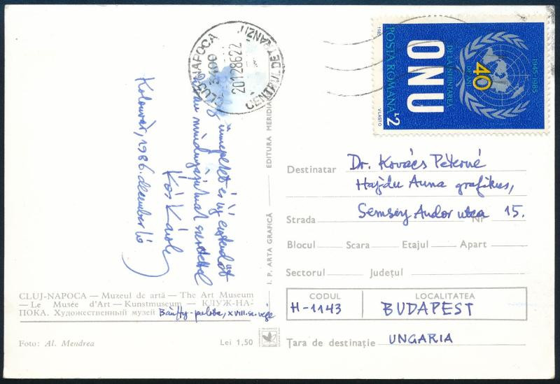 1986 Ifjabb Kós Károly (1919-1996) romániai magyar néprajzkutató, muzeológus, autográf karácsonyi és újévi üdvözlő lapja Hajdu Anna grafikus részére, 15x10 cm