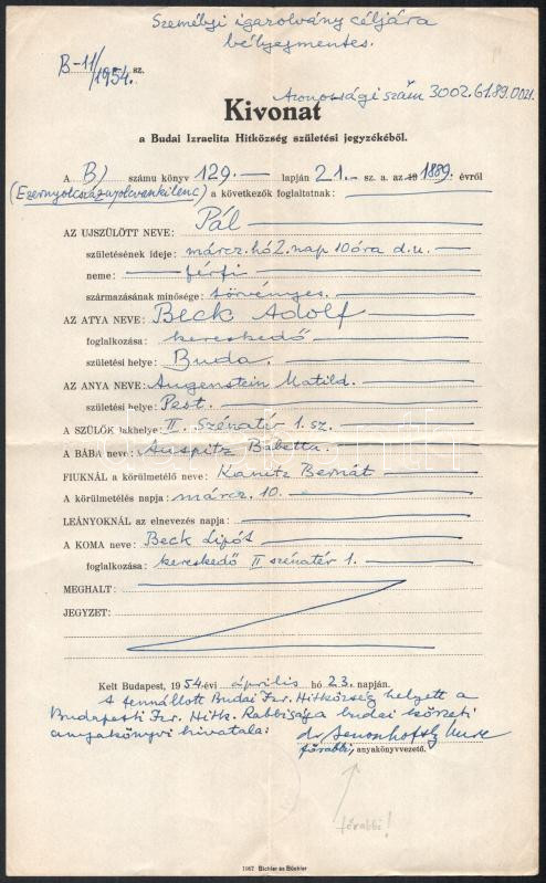 1954 Kivonat a Budai Izraelita hitközség születési jegyzékéből főrabbi... https://www.darabanth.com/de/457-Fernauktion/457.0/Kunst-Dokumente-andere-Sammelgebiete/Judaica~1500004/1954-Kivonat-a-Budai-Izraelita-hitkozseg-szuletesi-jegyzekebol-forabbi-alairasaval~II3030829