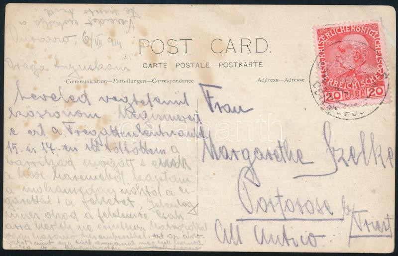 1914. Az osztrák-magyar haditengerészet géppuskás különítménye egy barikádon Durazóban. Albánia. A fénykép valószínűleg akkor készült, amikor a Nemzetközi Csendőrség megpróbálta támogatni Wilhelm zu Wiedi herceg rövid uralmát, aki 1914. március 7-én érkezett Albánia fővárosába, Durazzóba. A herceget a Habsburg-kormány támogatta. és osztrák erőket (beleértve a fényképen látható haditengerészetet is) küldték ki, hogy támogassák alakuló kormányát. Ám muszlim parasztok és görög ajkúak fellázadtak, és az I. világháború kitörésével és az osztrák fegyveres támogatástól megfosztva a herceg rezsime összeomlott, és 1914 szeptemberében elhagyta Albániát. A hátoldalán a barikádon szolgáló magyar katona üzenete édesanyjának / 1914 A k.u.k. Kriegsmarine's machine-gun detachment mans a barricade in Durazzo. The photograph was probably taken during the attempt by the International Gendarmerie to support the brief rule of Prince William of Wied, who had arrived in Durazzo, Albania's capital at the time, on 7 March 1914. The prince had the support of the Habsburg government, and Austrian forces (including the navy detachment in the photograph) were sent to buttress his fledgling government. But there were revolts by Muslim peasants and Greek-speakers and, with the outbreak of World War I and deprived of Austrian armed support, the prince's authority collapsed and he left Albania in September 1914. 14x9 cm