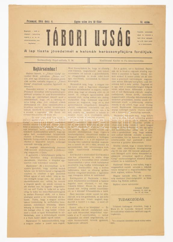 1914.XII.4, Przemysl, Tábori Ujság 51. sz., számos érdekes írással, 2 ... https://www.darabanth.com/de/457-Fernauktion/457.0/Kunst-Dokumente-andere-Sammelgebiete/Militaria~1500011/1914XII4-Przemysl-Tabori-Ujsag-51-sz-szamos-erdekes-irassal-2-oldal-magyar-nyelven-h~II3060337