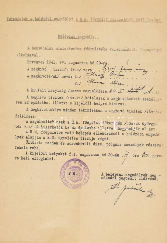 1941.VIII.20 Belépési engedély a honvédelmi minisztérium főépületébe, ... https://www.darabanth.com/de/457-Fernauktion/457.0/Kunst-Dokumente-andere-Sammelgebiete/Militaria~1500011/1941VIII20-Belepesi-engedely-a-honvedelmi-miniszterium-foepuletebe-hajtasnyomokkal~II3060290