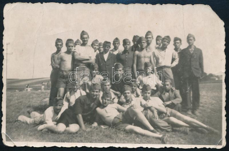 Beschreibung: 1944 Zirc, munkaszolgálatosok csoportképe, fotólap, törésnyomokkal, kisebb sarokhiánnyal, 13,5x8,5 cm