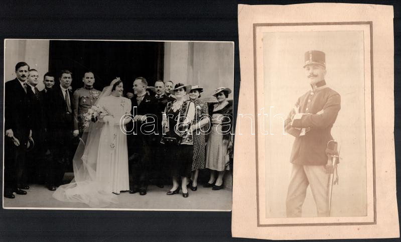 cca 1910-40 Katonatiszt karddal, jelzés nélküli fotó kartonon, körbevágva, 24x16 cm + esküvői csoportkép, háttérben számos kitüntetéssel dekorált katonatiszttel, Töry Ferenc budapesti fotóriporter pecséttel jelzett fényképe, 17,5x23 cm