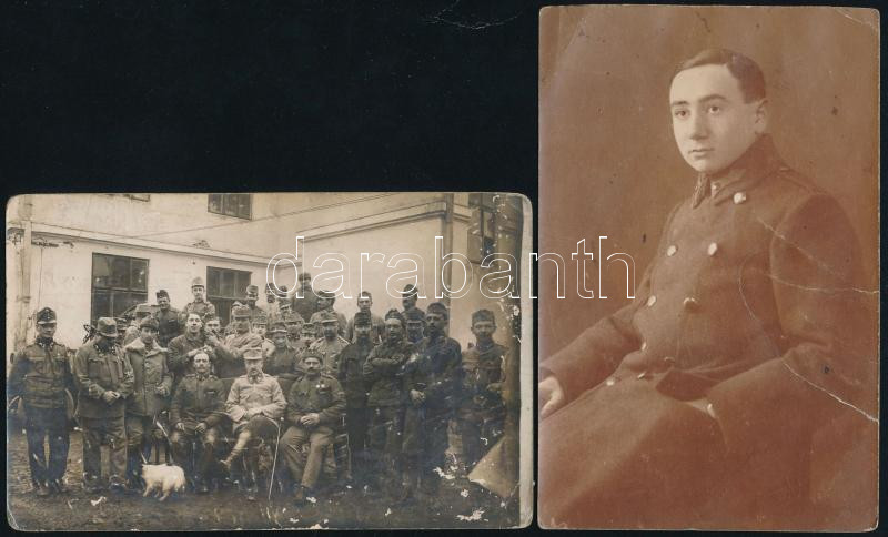cca 1916-20 2 db katonai fotólap, egyik 1916 I. világháborús csoportkép, hátoldalán K. u. k. Werkstättenauto bélyegzővel; másik portré, "YVOLI" budapesti műterméből, sérült, 14x9 cm