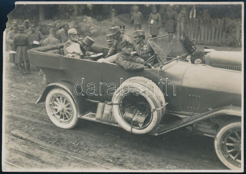 cca 1917 IV. Károly (1916-1918) magyar király és osztrák császár Kozowában magas rangú katonák társaságában, fotó, hátoldalon feliratozva, sérült, 12×17 cm