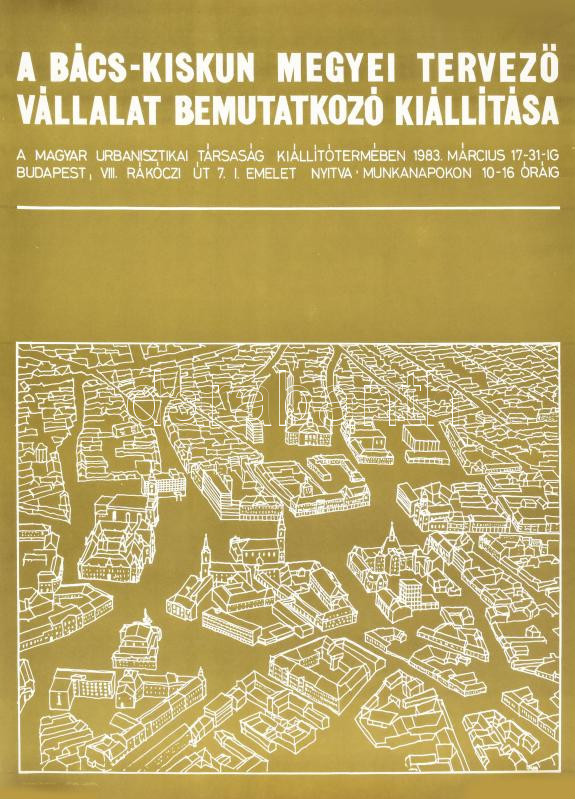1983 A Bács-Kiskun Megyei Tervező Vállalat bemutatkozó kiállítása, pla... https://www.darabanth.com/de/457-Fernauktion/457.0/Kunst-Dokumente-andere-Sammelgebiete/Plakat~1500016/1983-A-Bacs-Kiskun-Megyei-Tervezo-Vallalat-bemutatkozo-kiallitasa-plakat-feltekerve-55-5x~II3060232