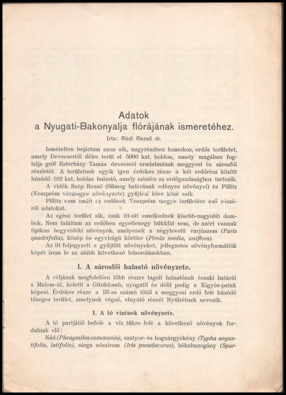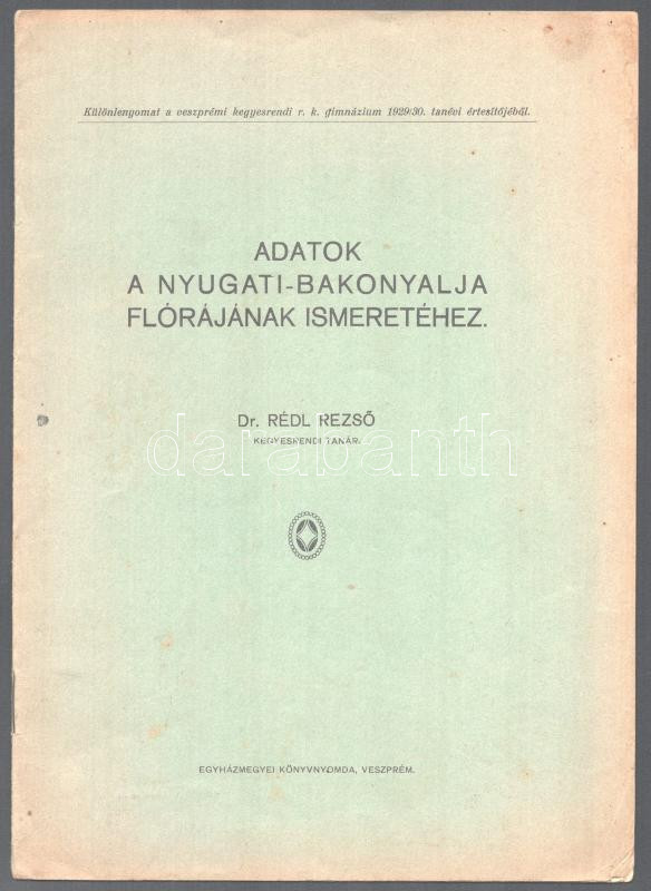 Rédl Rezső: Adatok a Nyugati-Bakonyalja flórájának ismeretéhez. Különlenyomat a veszprémi kegyesrendi r. k. gimnázium 1929/30. tanévi értesítőjéből. Veszprém,(1930), Egyházmegyei Nyomda, 8 p. Kézi rajzolás térképvázlattal. Kiadói papírkötés