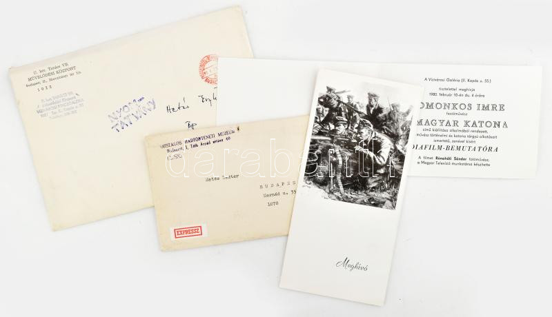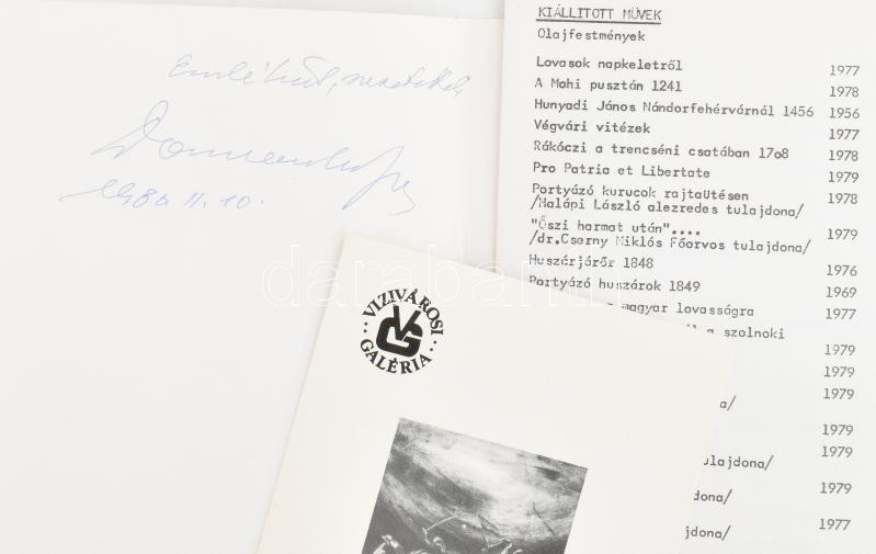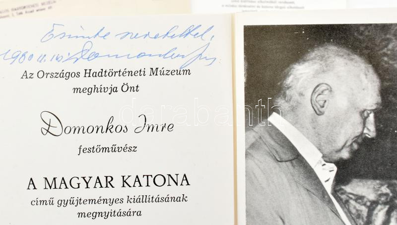 1980 Domonkos Imre (1917-1995) festőművész "A magyar katona" c. kiállításának meghívói, prospektusai, össz. 4 db, ebből három Domonkos Imre által DEDIKÁLT
