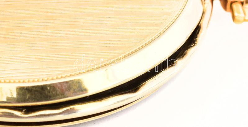 Beschreibung: 14K arany (Au) nyitott Doxa zsebóra. Hibátlan számlappal, jól működő szerkezettel, az arany keret sérült, ötvösmunkára szorul. d: 48 mm, br 54 g