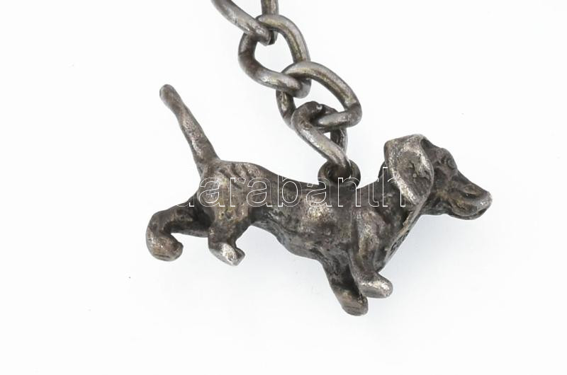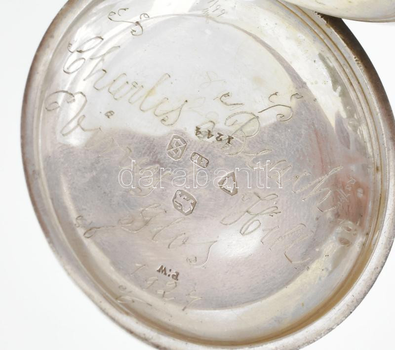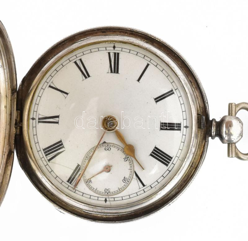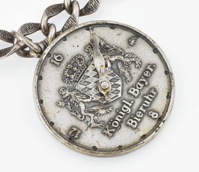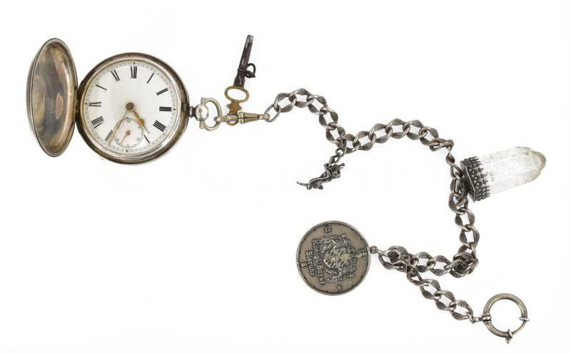 1873 Londoni óraműves, ezüst (Ag) zsebóra, jelzett, kulccsal, működik, fém óralánc ezüst (Ag) szerelékekkel (tacskó, hegyikristály ezüst foglalattal, bajor söróra), d: 50 mm